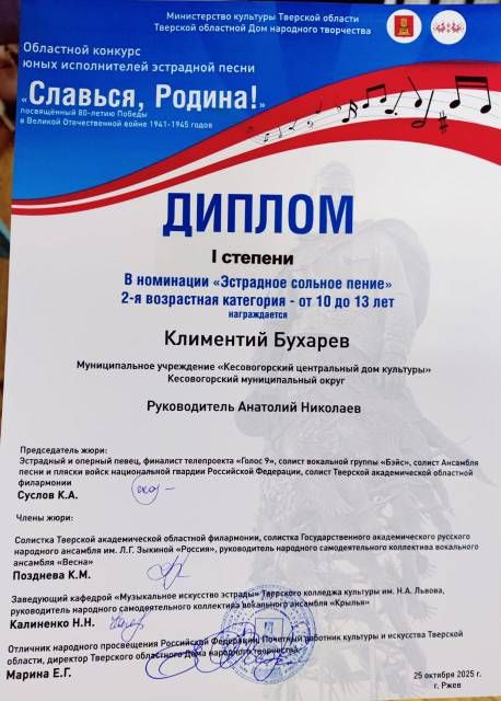 Кесовогорский муниципальный округ представлял Бухарев Климентий, его выступление жюри оценило дипломом I степени в номинации "Эстрадное сольное пение".