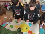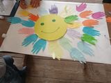 Наша встреча началась со знакомства с ребятами.На ладошках написали имена, небольшой рассказ о себе в трёх словах и наше весёлое летнее "солнышко" с разноцветными лучиками засияло.